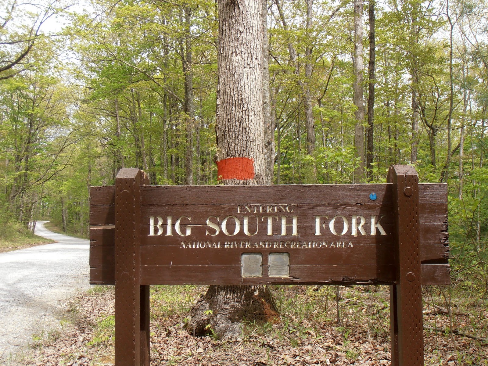 In early May, 2013, I headed back to Big South Fork for another short day hike. This time, I chose to visit Slave Falls and Needle Arch from the Sawmill trailhead in the southwestern part of the park. To reach the trailhead, travel north on TN 154 for 2.0 miles from its junction with TN 297. Turn right onto the gravel Divide Road and drive for 1.0 miles before turning right onto Ridge Fork Road. Follow Ridge Fork for approximately 1.1 miles and look for the parking area on the left. The road narrows significantly after 0.7 miles and the wide turnout to the Middle Creek equestrian trailhead on the left. There was even a "One Lane" road sign to the right on Ridge Fork Road when I was there. The trailhead parking area has several signs, a fenced portable toilet, and a bear-proof trash receptacle. The trail is wide and well maintained. Each junction on the trail is clearly marked with large signs usually protruding at least partially onto the trail. Even after the abundance of rain this year, there were very few wet or even damp areas along the trail. The one exception was the rockhouse along the spur trail to Slave Falls. Enough water was dripping off of the overhang that I had a fleeting thought that this was Slave Falls. However, I quickly recalled the park service website showed a wooden fence at the falls, so I knew this wasn't the end of the trail. There are interpretive signs at both Slave Falls and Needle Arch.